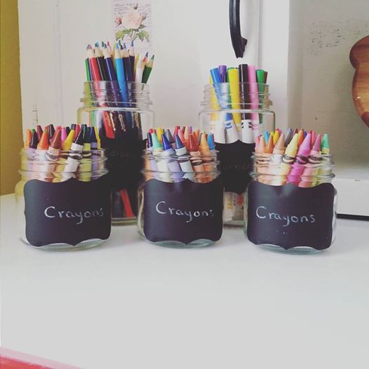 One thing I find so difficult is keeping everything organized. It always seems there are books, paper, crayons, and pencils scattered around the house. This year I've decided to try to keep things a lot tidier but make it look cute at the same time. I searched in every cabinet of my house in search of jars that I could use. I found a few pint jars, some decorative jars that I bought at Target during the Christmas season, as well as a milk bottle. I used chalkboard stickers and labeled each jar according to their contents. ** Tip: Use a white crayon or colored pencil to write on your chalkboard stickers. It doesn't smudge and gives the same effect!! **